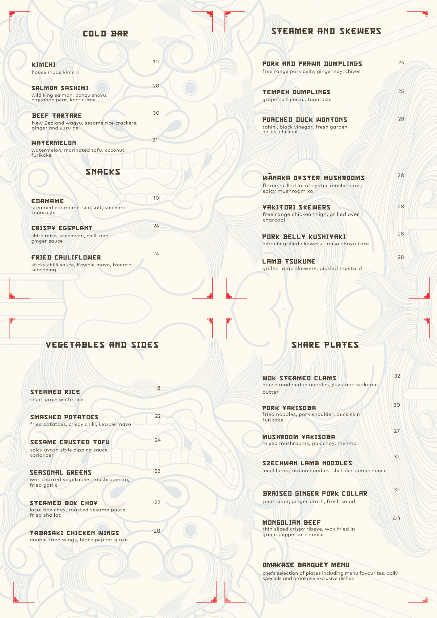 Our menu is constantly evolving with our main influences stemming from modern Japanese, Chinese and Korean cuisine.